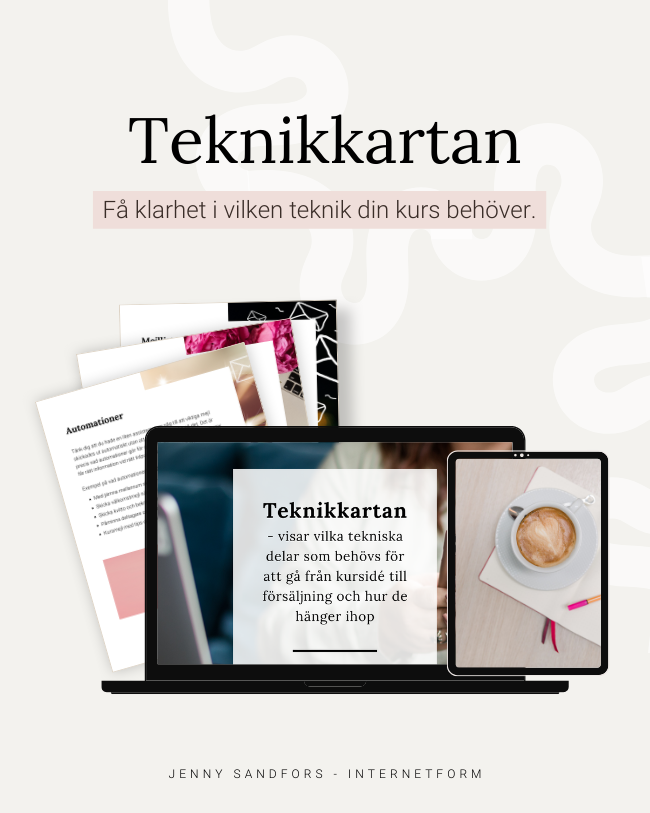Teknikkartan ger dig klarhet i vilken teknik som behövs bakom en säljande kurs eller medlemskap. Och hur allt hänger ihop.